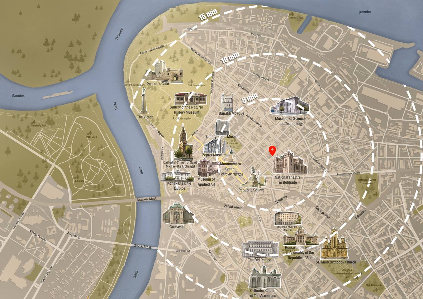 Our apartment enjoys an ideal location, placing you close to numerous attractions, allowing you to effortlessly delve into the city's rich history and lively ambiance. In just a leisurely 7-minute stroll, you'll arrive at Knez Mihailova, the vibrant pedestrian street renowned for its charming shops, bustling cafes, and lively atmosphere. You can reach Republic Square, an iconic square serves as the city's vibrant heart, surrounded by architectural marvels, in just 4 minutes. Visit National Museum Belgrade, a treasure trove of art and history, it is free on Sundays ;) A mere 20-minute walk away lies Kalemegdan, a vast fortress complex proudly standing at the confluence of the Danube and Sava rivers. Wander through its serene park, filled with hidden corners and historical significance. With such a convenient location, you'll have the freedom to explore these incredible attractions at your own pace, ensuring that your stay in Belgrade is brimming with unforgettable experiences and cherished memories.